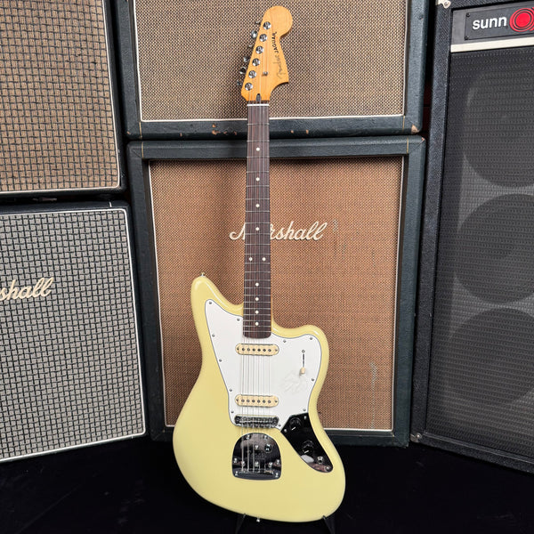 The Player II Jaguar radiates timeless Fender charm, but under the hood, it's primed for today's players. Everything about the neck is designed for fast and fluid playability, from the Modern “C”-profile with silky satin urethane finish on the back to the comfy 9.5”-radius slab rosewood with smooth rolled edges and 22 medium jumbo frets. A classic alder body is available in both timeless Fender finishes and never-before-seen colors unearthed from the archives. Player Series Alnico V (Bridge) and Alnico II (Neck) Single-Coil Jaguar pickups offer crystalline highs, musical mids and tight lows that elevate any genre. The 3-way blade switch lets you easily dial in everything from glassy neck pickup chime to cutting bridge pickup bite and all points in between, while a 6-saddle Jaguar bridge with Floating Tremolo, upgraded Mustang® saddles and ClassicGear™ tuners ensure precise tuning stability for the flexibility to explore endless sonic possibilities.