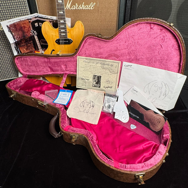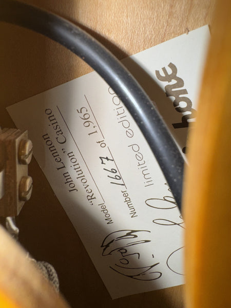 Hey Gang! Here's a commemorative one for ya - Early 2000's Epiphone E230TD John Lennon "Revolution" with the original case and all the case candy. They don't get much cleaner than this! Dare we say Dead Mint! Hard to know if it was actually played much at all. Stunning condition, with stunning tone. Only 1965 were made and this one is hand numbered #1667