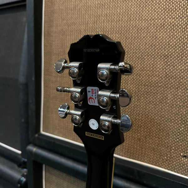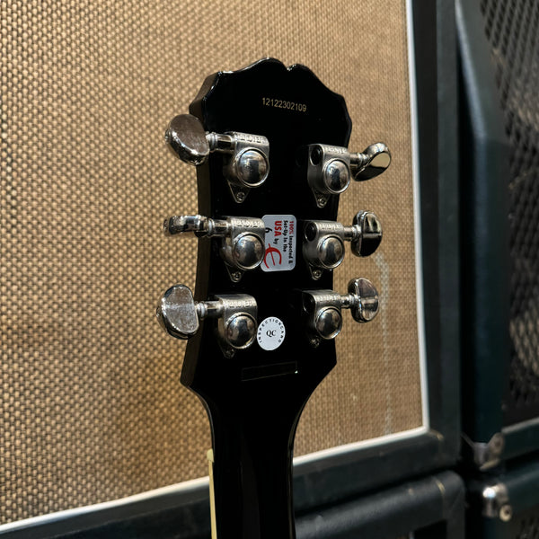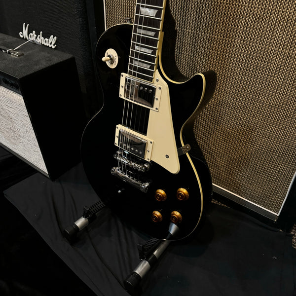 Hey Gang... Here we have a lovely Epiphone Les Paul from 2012 in a Black finish with a White pick guard. This is an absolute rocker of a guitar featuring dual humbuckers that give a nice bite to your tone but still with a full sound and great clarity. The neck has a chunkier build that feels excellent in hands whether you're playing chord progressions or soloing. There is no faulty hardware on this guitar and will be a very reliable instrument for either gigging or just casual playing. If you're in the market for a Les Paul, you may want to consider getting this Epiphone model because it truly is one of the smoothest playing Epiphone's that we've had our hands on!