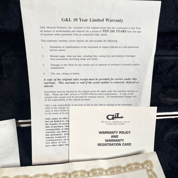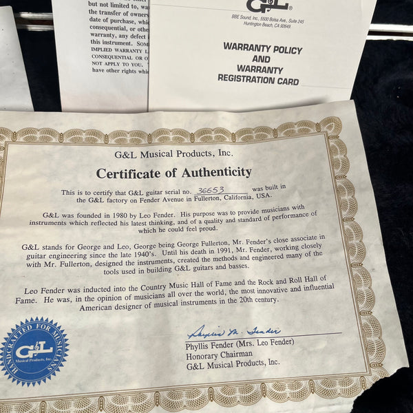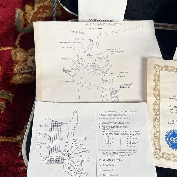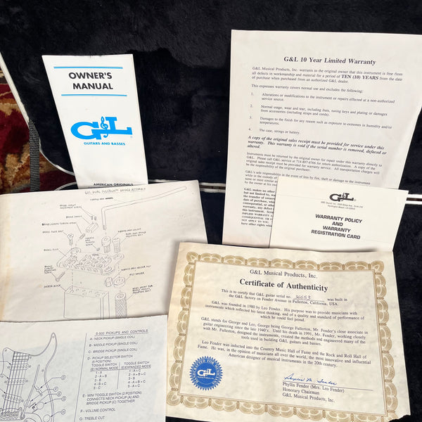 Elevate your playing experience with the One of a Kind One Owner Left Handed 1994 G&L S-500, a distinctive electric guitar that seamlessly blends captivating aesthetics with top-tier playability. The visually arresting black swirl finish not only catches the eye but also sets the stage for the sonic prowess within. The clear original plastic untouched still on the pickguard.