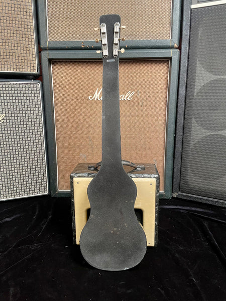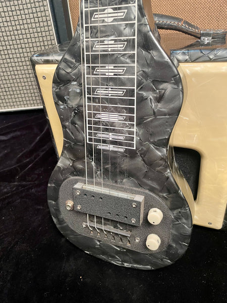 This lap steel has a gorgeous vintage look and sound. The pickup, one pot and at least one control knob are unoriginal. Cosmetically there are various scratches, nicks and dings throughout the instrument. There is consistent checking throughout the paint on the fingerboard with some chipping. All electronics and parts are in perfect working condition.