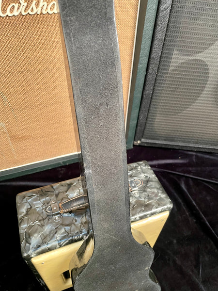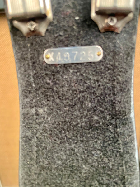Body: Solid body with rounded bottom and graduated shoulders in a gray pearloid finish. One-piece tailpiece.bridge with dual plastic control knobs. Black pickup cover with dual thumb screws.