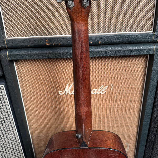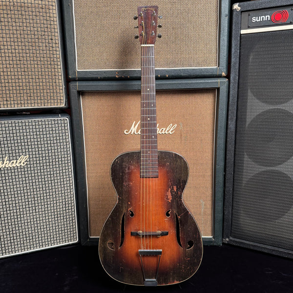 Hey Gang! Another Rare find here at Guitars West. Feast your eyes on this well played, but certainly loved nearly 100 year old 1933 Martin R-18 F-Hole in sunburst Finish! Come with a non-original tweed style case built for luxury. Overall condition is clear by the photographs that this instrument has been well played and has quite a few player scars and a strong wear on the finish. We've been searching high and low, but have been unable to locate an original pickguard for her, so she will go without. The tuners look to be period correct reproductions, and at one time the D string tuner was possibly a deluxe Kluson by the looks of the indentation. We do see on the sides and bottom of the guitar some possible crack repair, and a small puncture hole near the rear strap-button. Despite it's heavy wear, the guitar's playability is fantastic and sound warm and resonate. A strap button was added to the lower dovetail, but other than the tuners, a fresh bone nut, a top-notch refret, she's all original. Grab this while ya can - they certainly don't come up for sale often in the F-Hole Style!
