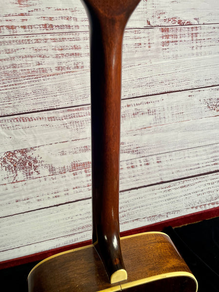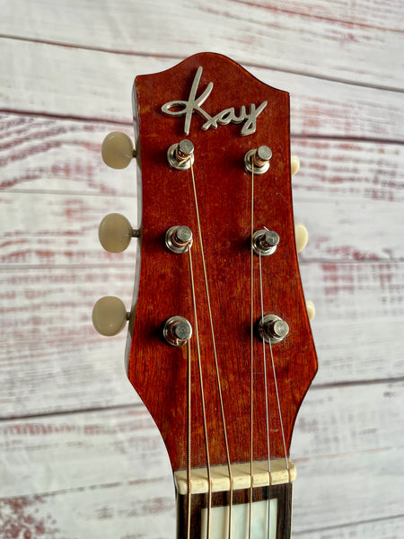 Hey Gang! Who doesn't love a Jumbo from the 50's? This one is a fine example of Kay's hayday, with some bumps and bruises, sure. Overall, in fantastic shape and plays great. Soft "V" shape neck and frets are in great shape. Wonderfully big sound and playability are there. 17 1/4" lower bout width and nearly a 42" length. The guitar features a solid spruce top, laminated mahogany sides, and possibly a solid mahogany back.