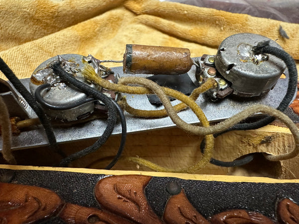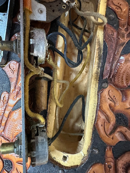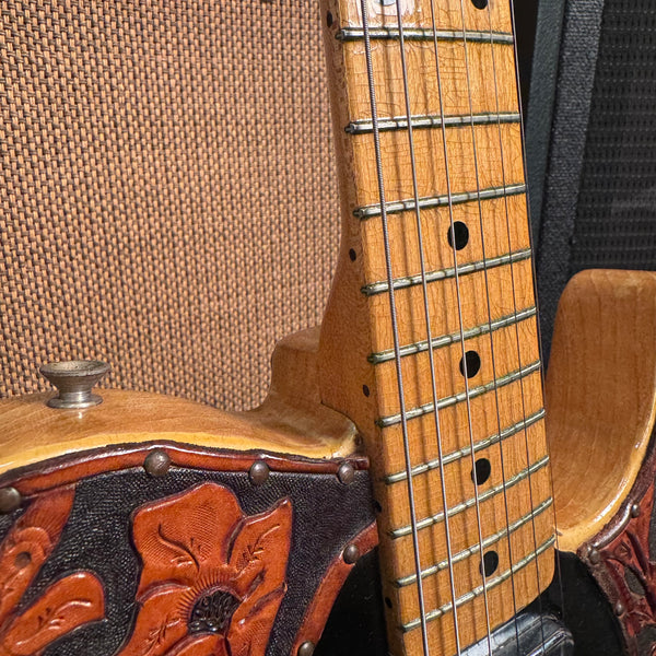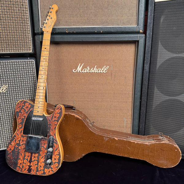 Hey Gang! Well, well, well. Don't be shy... Ask away... I'll try to make this short. Right? This walked in the shop not long ago. We're just listing it this last weekend in June. As you can see the body date clarifies that it is a Nocaster. Contact Guitars West for more info. The neck is a '56. Now Leo's great idea..!! The frets shot, just buy a new neck..!! Smart guy... 99.9% all original parts. All slotted screws. A hole drilled in the center of the control plate. We think it for a kill switch that was added and taken off. Which we found in the case. The back and sides have been refinished. I did pull the guard. Like new. The tooled leather work on the top and the matching guitar strap is great job. Chet did a pretty good job. The leather work is archaic, but done with care by Chet. Small brass nails have secured to the body. The leather is still in beautiful condition as is the guitar strap. The case is real nice as you can see, and worth a mint in itself. We're get the weight and a vid out first part on the week. We just wanted to get her listed.