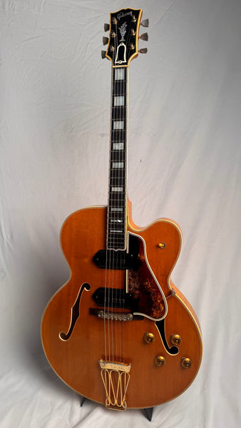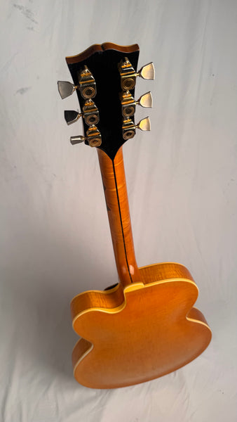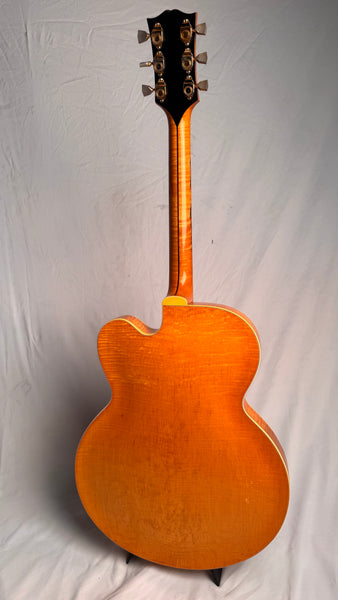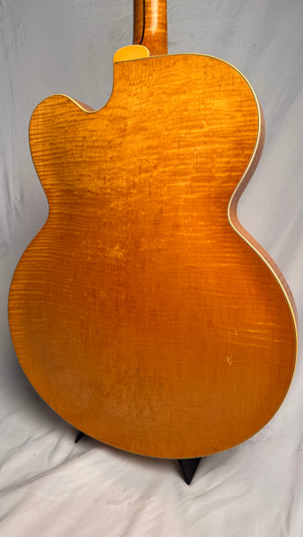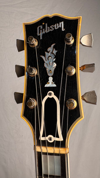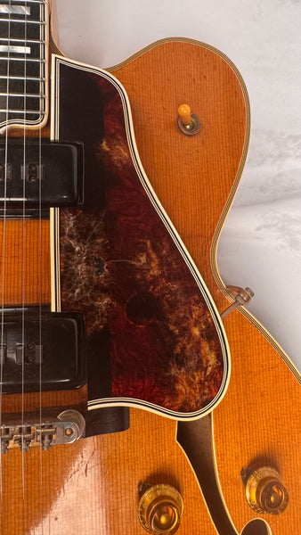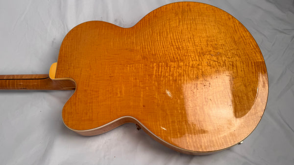 Body thickness is 2 1/4" (5.7 cm), frets show some wear up and down the neck as he was a definite jazz-man, although playability is unaffected. Scale length of 23 1/2" (60 cm). Spruce Top, Maple Body, Maple Neck, Ebony with Pearl Block Fretboard. The pickguard does show significant aging and wear although it is holding together just fine. Tun-o-Matic Bridge, and the coolest Alnico 5 Staple pickups. Comes with the Original Pink-Lined Brown Lifton Case.