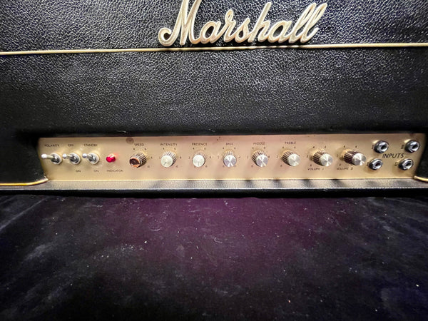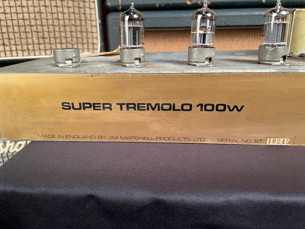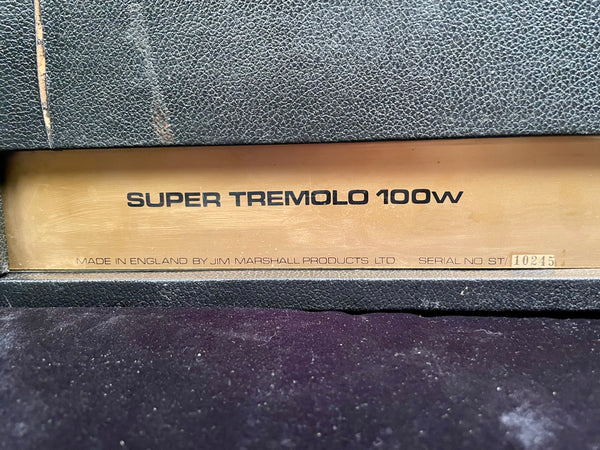 Hey Gang, Just in...! 1969 Marshall Super Tremolo 100 Watt Plexi. One main thing is I did detailed the cab inside and out. And that in itself is worth millions...!!! A very old Marshall correct R.I. logo. Let the story begin. First off. Chris Merren did all the service work on this amp. Top to bottom. And those who know. Know...! The best in the Marshall World. Let's start with trem. It always has to be disengaged. It sucks the life out life out of it and it loses it balls...! All filter caps have been replaced . New set of tubes replaced and biased. The amp is smooth sounding with plenty of gain. Bass at 1 or 2. Presence and middle at about a 5 or 6. Volume at 11 and and you disappear... !!!! I'm not brag'in. Just the facts. We saw the chassis holes. For the life of us, we don't know what was there. She's perfection now. Any other info let us know. BH at Guitars West, Inc in Murrieta, Ca. 92562