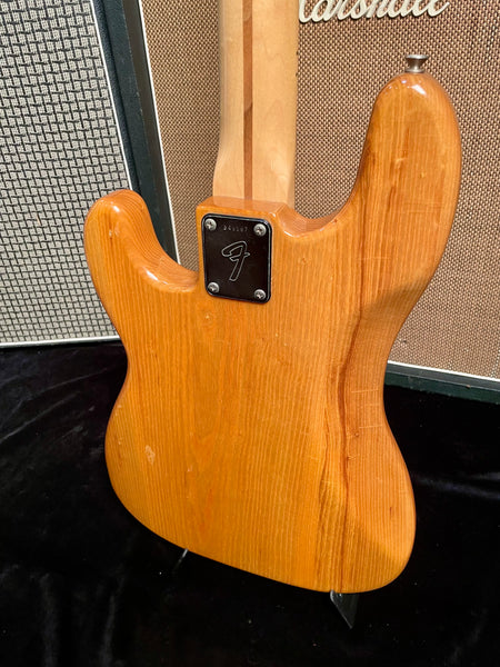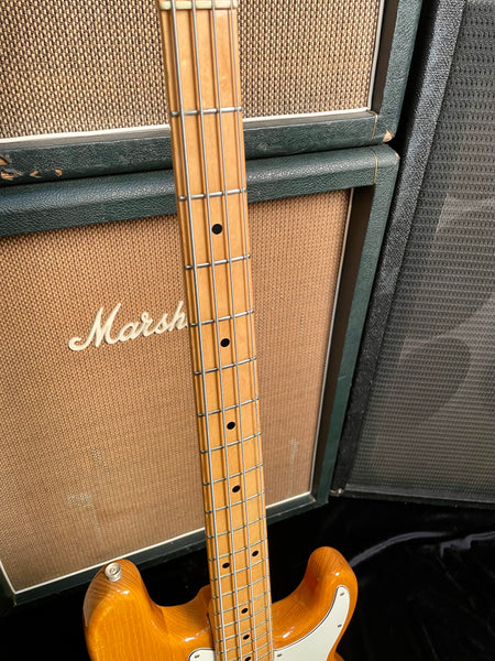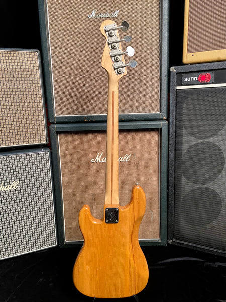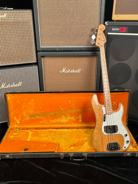 Vintage 1974 Fender Precision Bass in Natural finish, an iconic instrument with legendary tone and playability. Featuring an alder body, maple neck with a comfortable "C" profile, and a maple fingerboard with 20 frets, this bass delivers the rich, punchy sound that made the P-Bass a favorite among musicians. The split single-coil pickup provides deep, warm lows and clear mids, complemented by simple volume and tone controls for classic versatility. With its original hardware, this well-preserved piece shows signs of use consistent with its age but remains in good condition, maintaining its vintage appeal. The signature sustained resonance and smooth playability make this a fantastic choice for collectors and players alike. Whether you're looking to capture the iconic 70s Fender tone or add a timeless classic to your collection, this 1974 Precision Bass is a true gem with undeniable character and history. Don't miss the chance to own a piece of bass history!