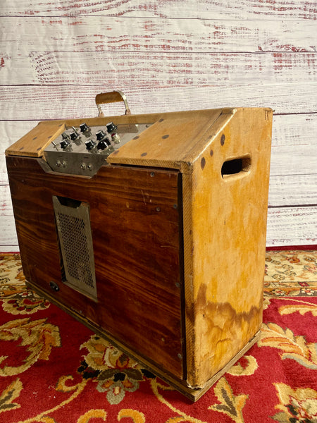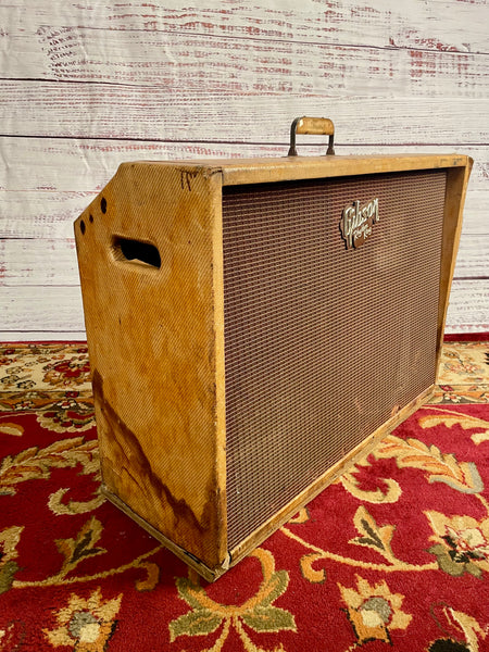 Hey Gang - Up for grabs is our 1959-60 Gibson Rhythm King GA-200. A.K.A. "The poor man's Twin". This one is ALL Original and boasts the coveted 12" Norelco Speakers. These amps are the hidden secret to many out there, and at a fraction of the cost to a Tweed Twin of the same era. 6L6 Power Tubes - 6eu7 Preamp Tubes - 6BD6 Tubes - GZ34 Rectifier Tube - 6FM8 Tubes for the compressor circuit. As clearly seen in the photos this one has been through many a stage battle, but it came out winning the war. 3-Prong Power Cable installed. Tested and working great!