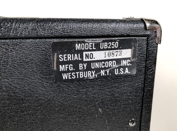 Look at our newest little fellow! This is a super cool 1975 Univox model UB250 piggyback bass amp. The UB250 is a piggyback 20w bass amp (advertised as 50W "music power" i.e. peak), with a 1x15" speaker, 2 inputs, volume & tone knobs and 5 transistors. The amp was made in the U.S.A. The amp is in good, working condition. Lift the Lord's name on high every Sunday with this perfect non-denominational rig in your arsenal.